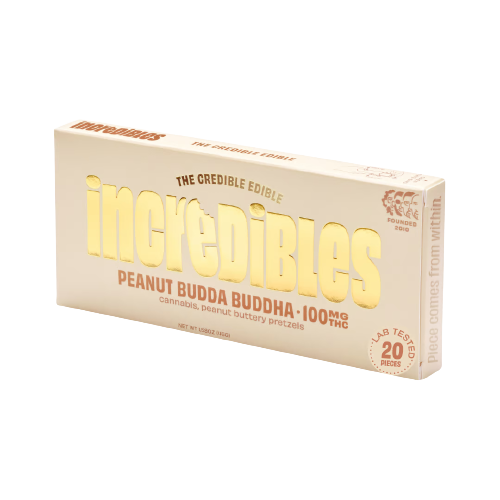 Piece comes from within. Enlighten your tastebuds with this bite of heaven. Savory pretzels, peanut butter, blissful well-being. incredibles Peanut Budda Buddha bar offers 100mg THC total, with 10mg THC per square. Made with pure THC distillate in a homogeneous mixture to ensure accurate dosing and consistency.